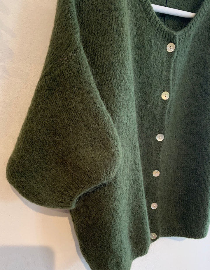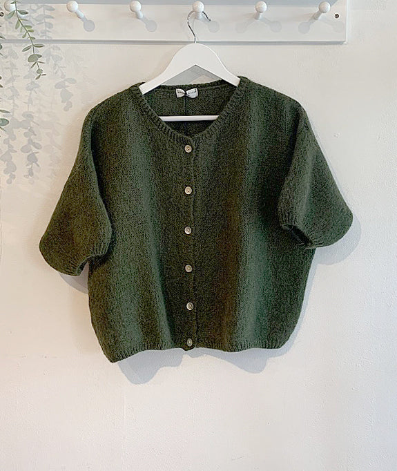 Make this your new casual chic staple! The Carys short sleeve knitted cardie is just perfect for when you need that extra layer. Crafted from a luxe Mohair Wool blend, it is fashioned in a relaxed boxy fit with a round neck and cropped balloon sleeves. It features a row of pretty pearlescent buttons at the front and a fine ribbed detail at the hem, neckline and sleeves. Ideal for seasonal layering, this versatile knit looks great worn on its own or layered over a dress.