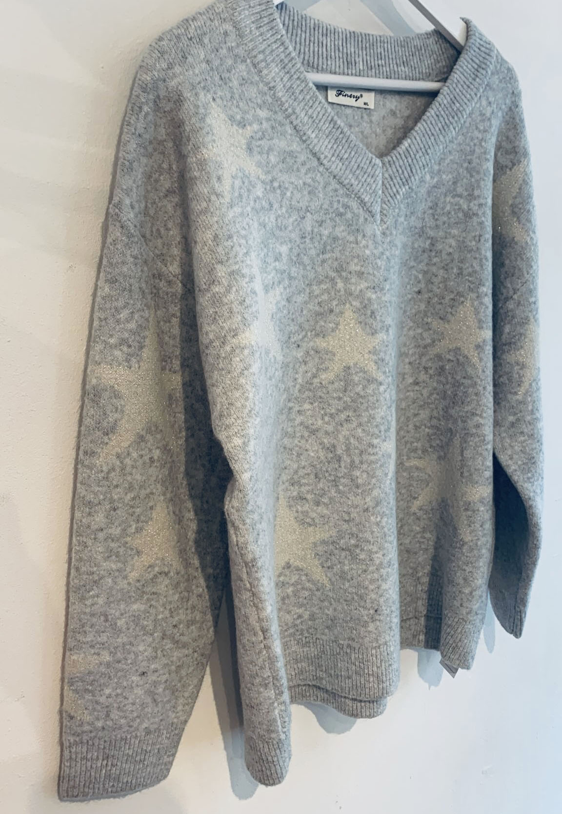Take your knitwear to starry heights with the Astrid jumper. Featuring an eye catching all-over White star design with a subtle sparkle, it is cut in a relaxed, slightly oversized silhouette for the ultimate comfort. It is crafted from a soft chunky Silver wool blend, designed to keep you snug and stylish all season long, and is fashioned with long sleeves and a v neck. A ribbed trim at the cuffs, neckline and hem add a polished finish. Perfect for pairing with jeans or leggings, the Astrid knit brings a touch of charm to your cold weather wardrobe.