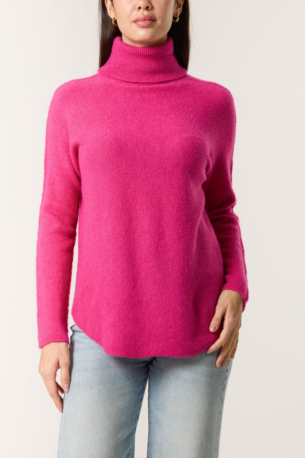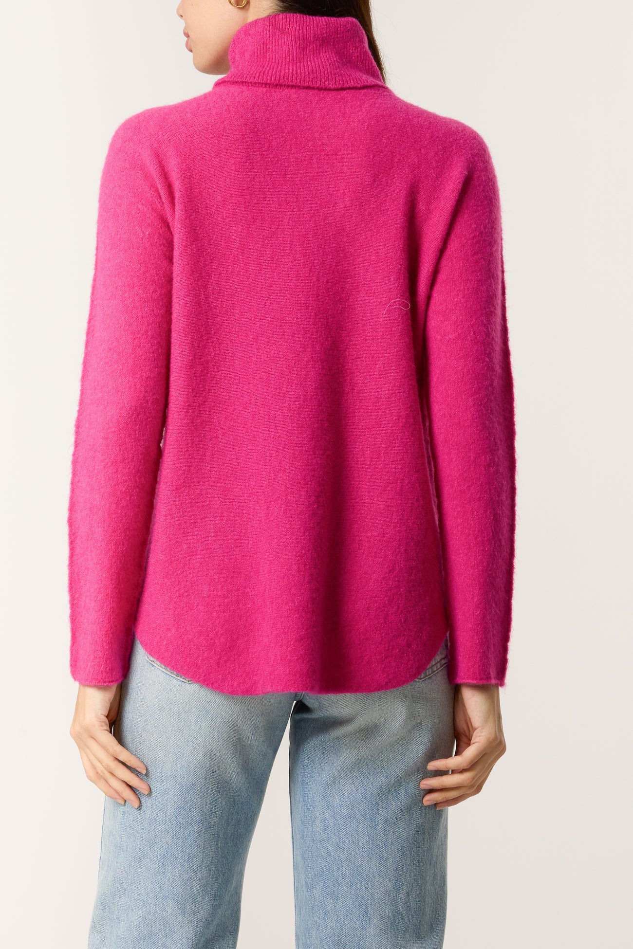 Soft and sumptuous, beautiful and elegant - this is the Sofia knitted jumper. This Italian jumper in a vibrant Fuchsia, is divinely snug with a fine ribbed roll neck and long slim sleeves featuring a seam detail. It is styled in a relaxed cut with a curved hem, and is perfect for the cooler months!