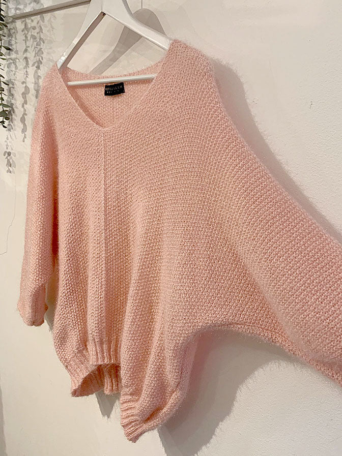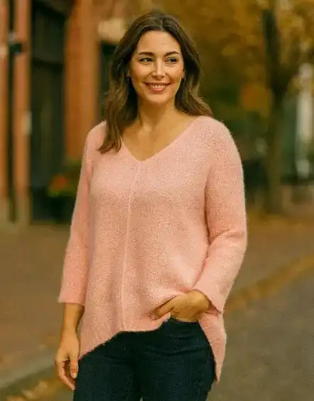 Add some textural interest to your outfit with the super stylish Lizzie jumper. This soft to the touch Boucle style knit is styled in boxy, relaxed silhouette with a v neck and front seam detail. It features cropped sleeves and ribbed detail at the cuffs and hem. Effortlessly stylish, it looks great with jeans and skirts alike.