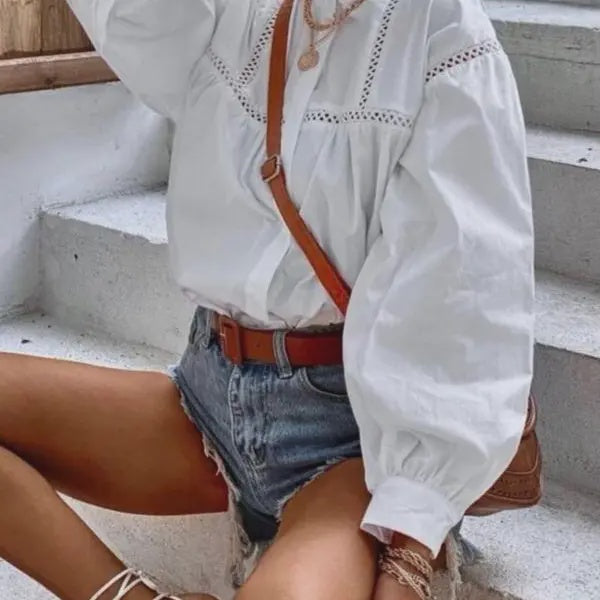 Opt for feminine flair with the Diana blouse and its cute ruffle and ladder embroidery detailing. Crafted from a White Cotton it features a grandad collar with a ruffle trim and pretty ladder embroidery panels at the chest and shoulder. It is cut in a loose, relaxed fit with a button through front and long balloon sleeves gathered into buttoned cuffs. Layer under a knitted tank top for super stylish on-trend look.