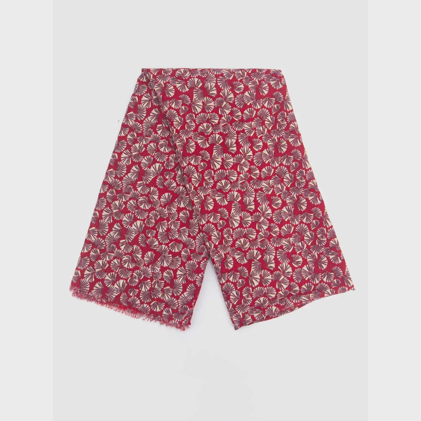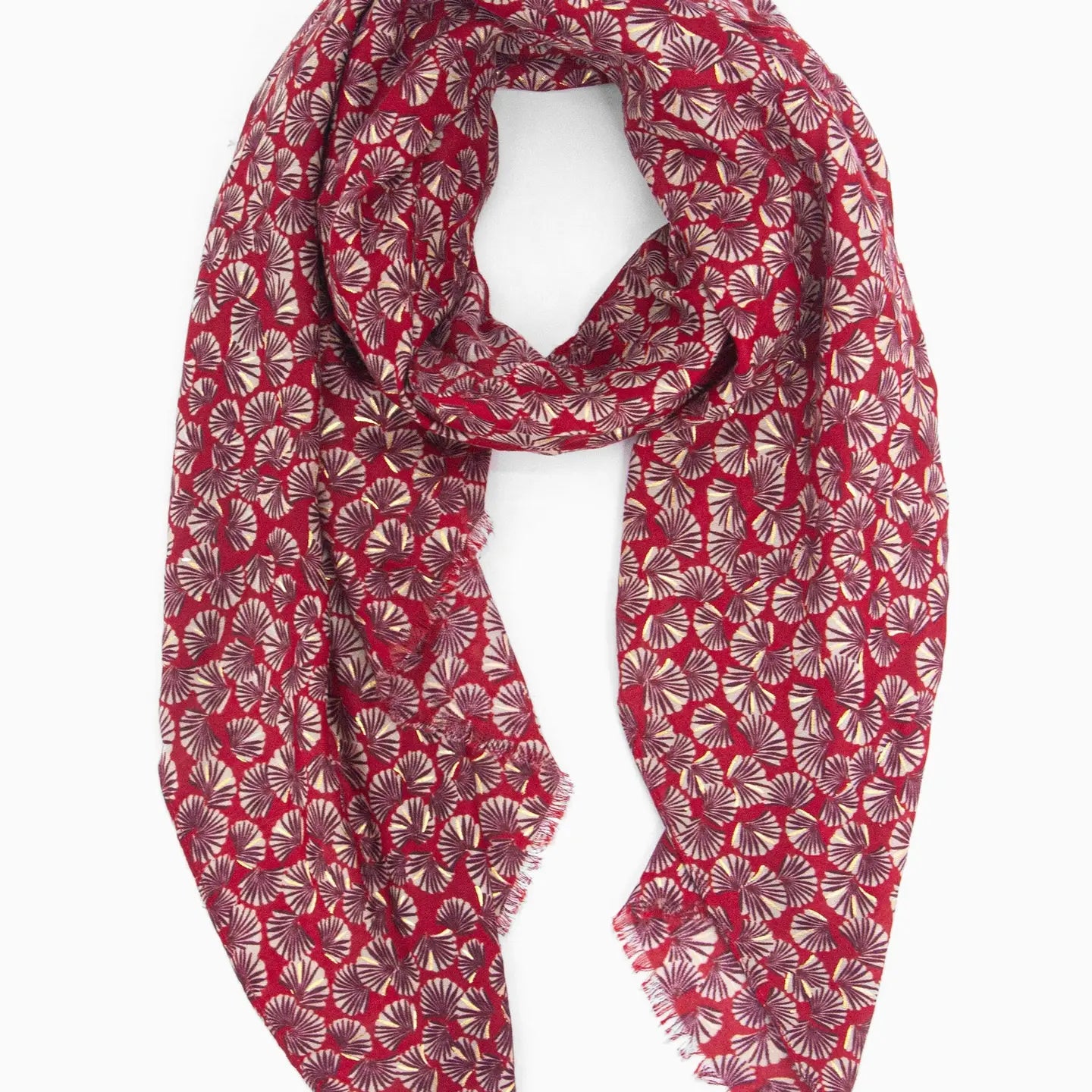 Crafted from lightweight soft Viscose yearn, this retro influenced scarf showcases an ornate fan pattern with metallic foil highlights, and is finished with a neat, short frayed edge. A statement scarf designed for seasonal versatility, this accessory can be worn many ways.
