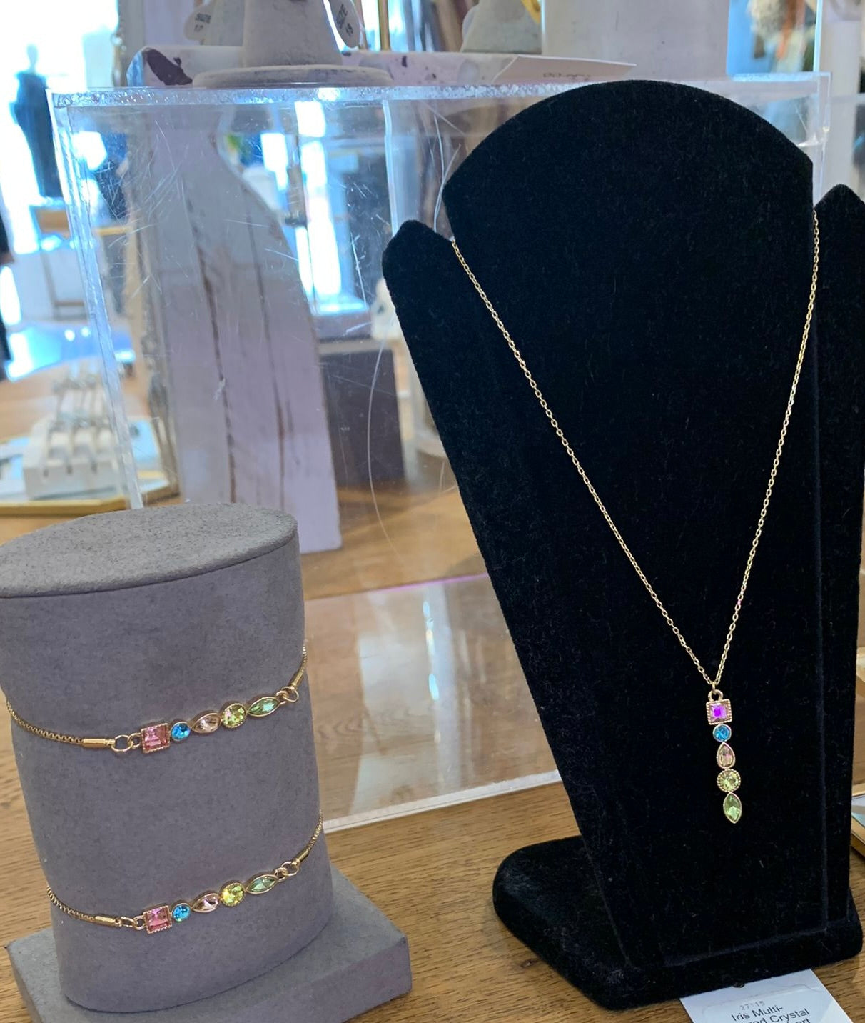 Show off your colourful side with the Iris crystal pendant necklace. Fastened with an adjustable lobster clasp, this pretty short necklace features a delicate Gold tone chain, with a multi-coloured crystal stones pendant. These round and tear drop gems are carefully arranged in a vertical design for an extra bit of character. A statement piece perfect for your formal or casual wardrobe, whether you're dressed to impress or for whenever you're feeling exceptionally fabulous.