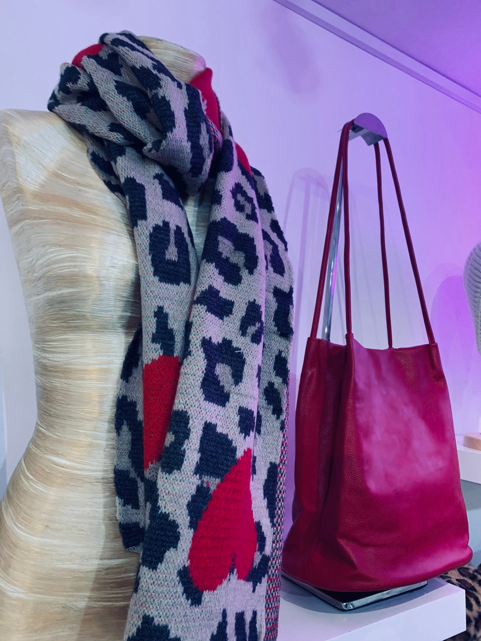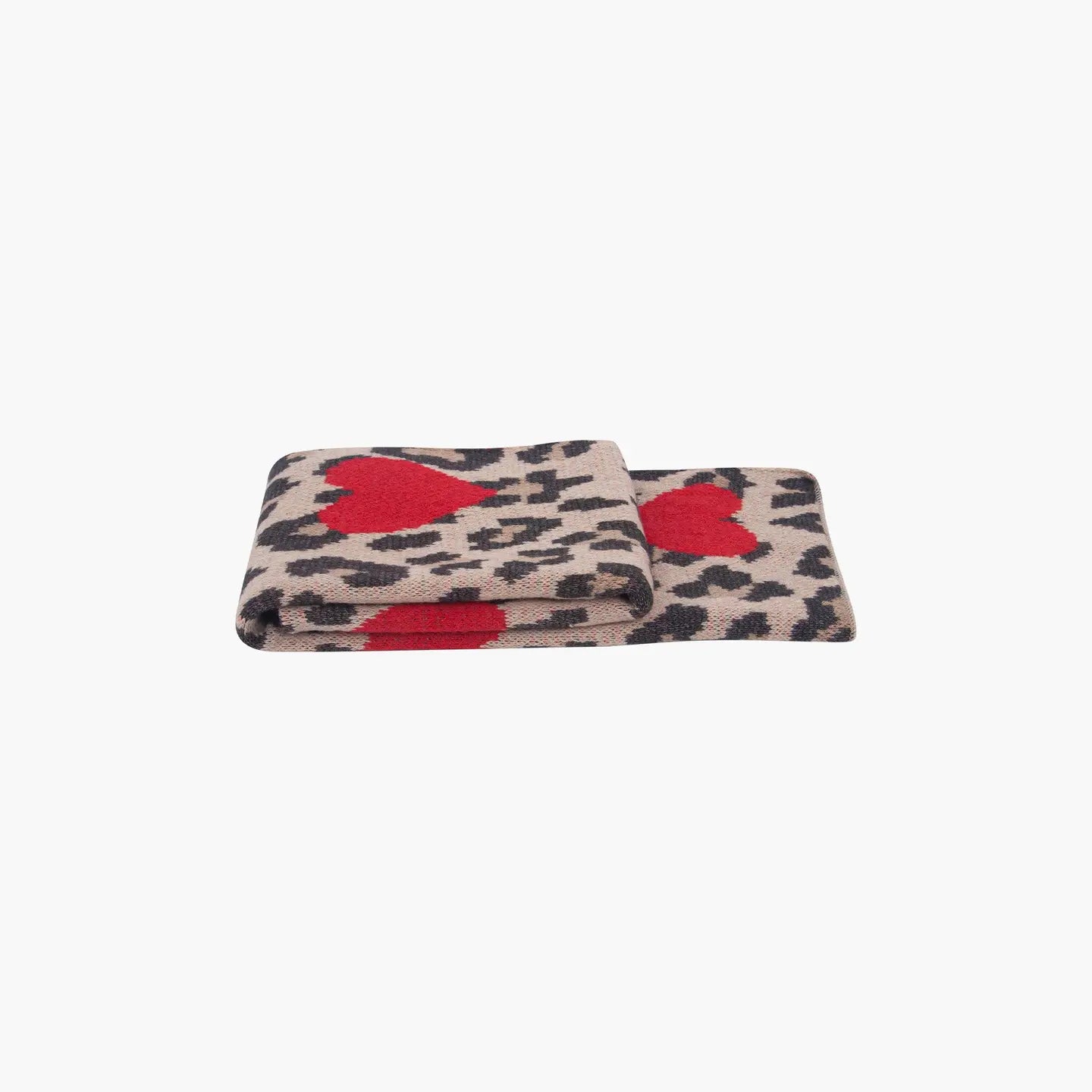 The heavyweight Wylda scarf features a unique combination of bold Red love hearts and a classic Tan and Black leopard print pattern. Crafted from blended Acrylic yarn, this colourful winter scarf is designed for warmth.