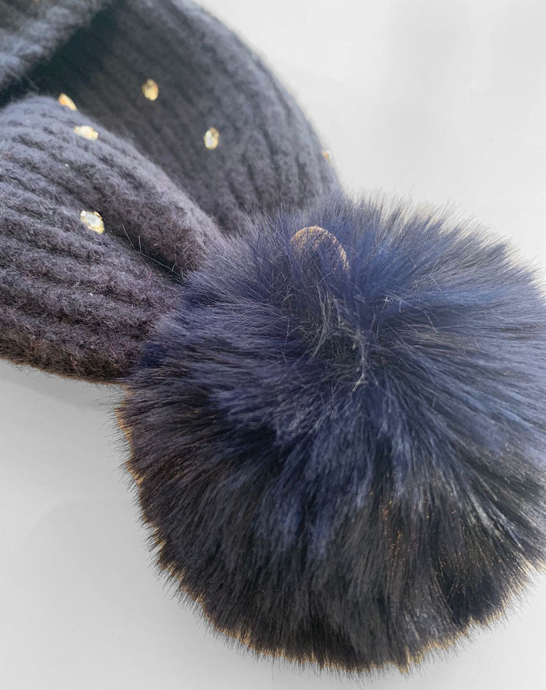 The Stella is super sparkly beanie style hat crafted from a soft ribbed Navy knit and adorned with Silver diamante. This stylish seasonal accessory has a thick ribbed fold over trim and is finished with a fluffy Navy faux fur pom pom.