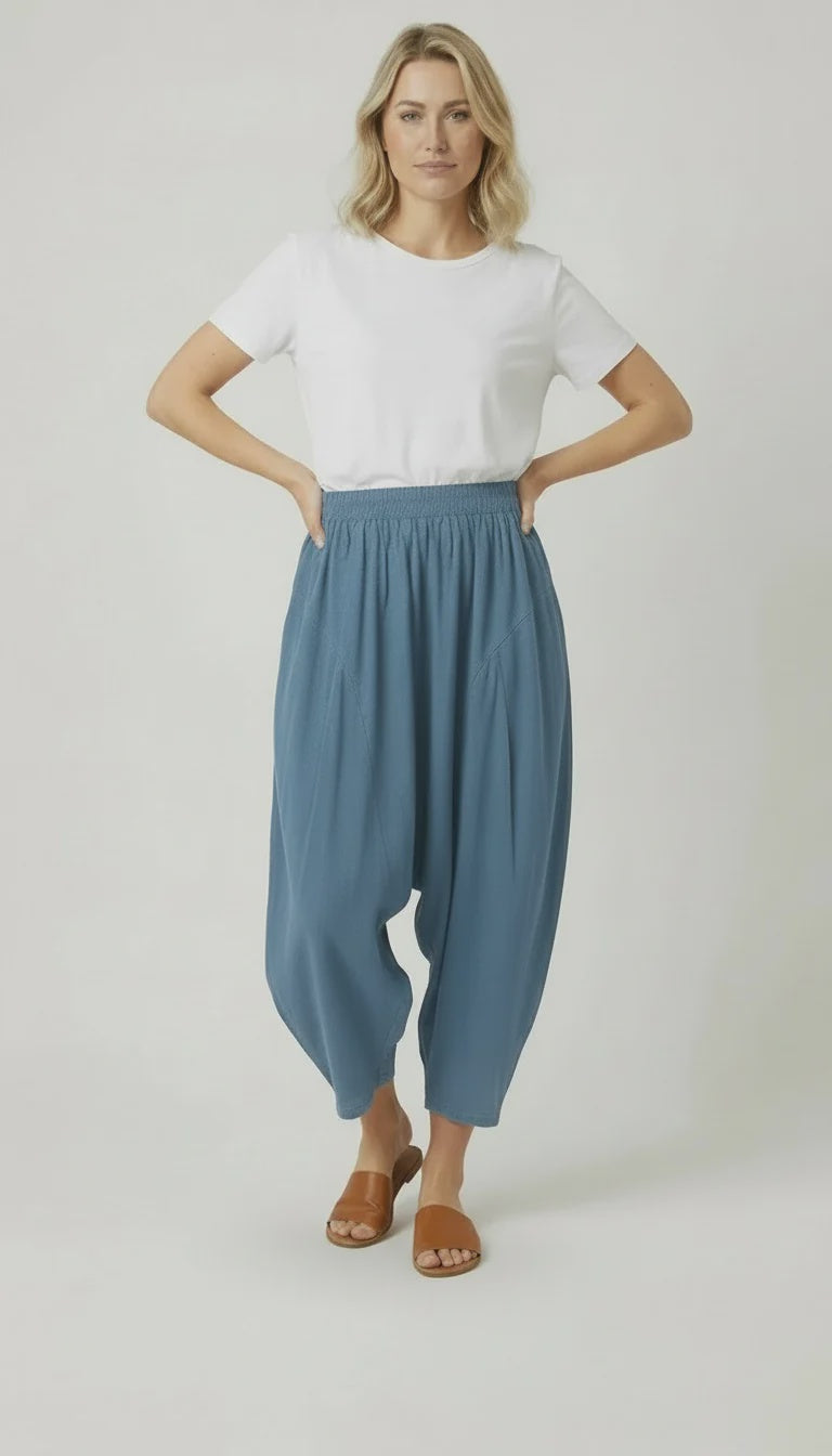 The Eliza trousers are fashioned in a relaxed harem style design to create an effortlessly stylish look. Made for all-day comfort and easy elegance, they are crafted from a lightweight, breathable Cotton and designed to create a flowy flattering silhouette, with a slouchy leg tapered to ankle length. Ideal for casual outings, travel, or lounging, these Italian trousers feature a soft elastic waistband and side pockets. Style them with a simple tee or tunic for a laid-back, chic look.