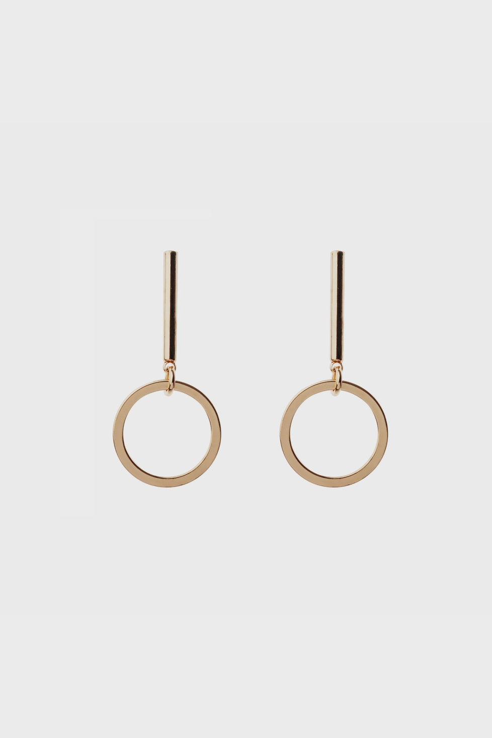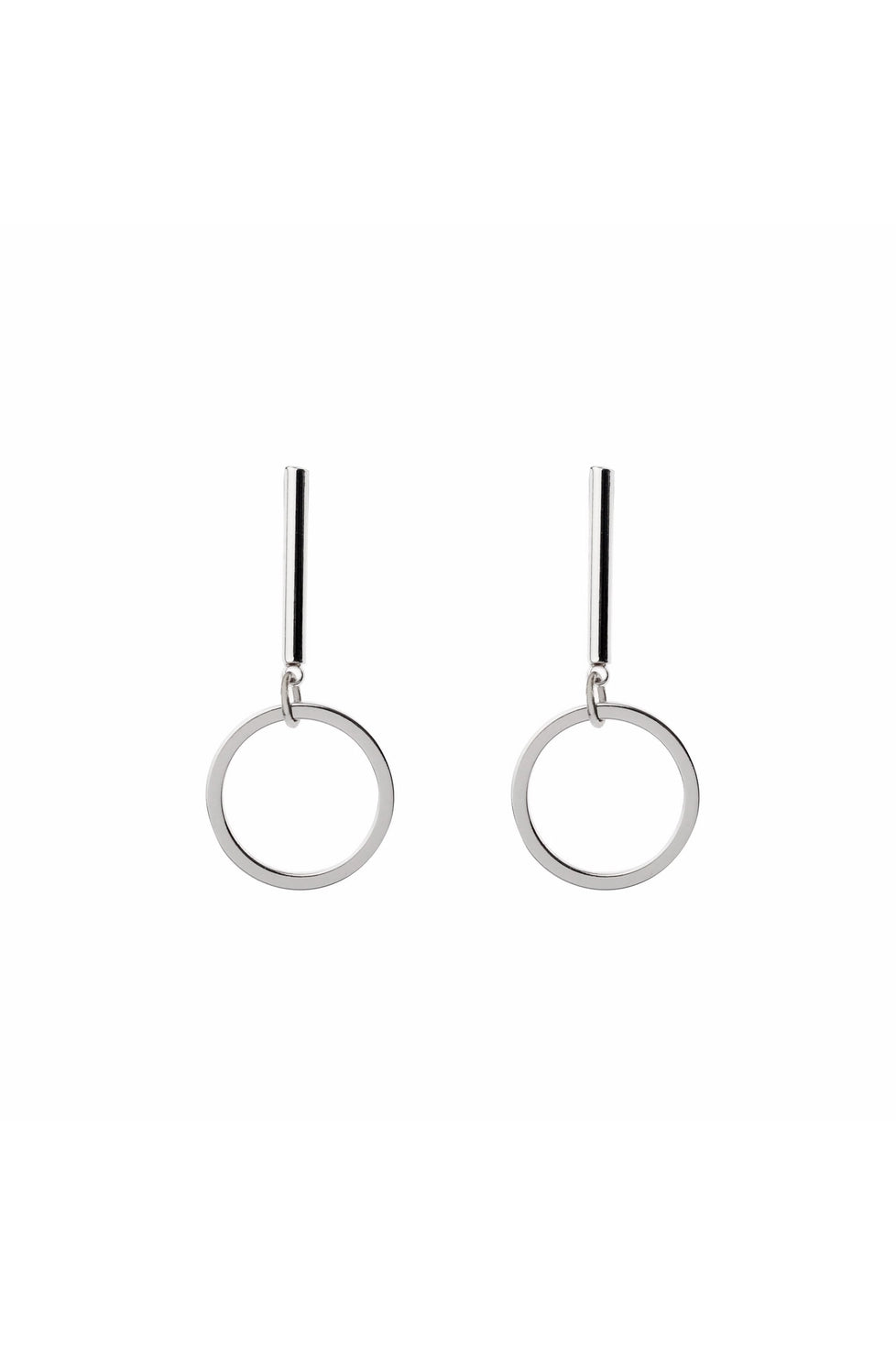 These elegant drop earrings combine sleek simplicity with modern flair. A polished bar suspends a delicate ring, creating a dynamic drop design. Its minimalist aesthetic makes it versatile for both casual and formal looks and the polished finish adds a touch of sophistication, perfect for any occasion.